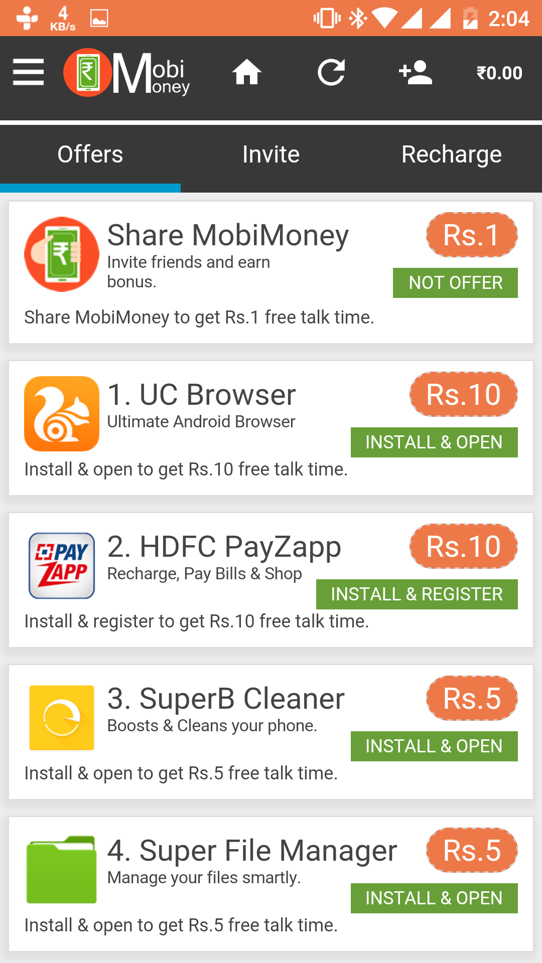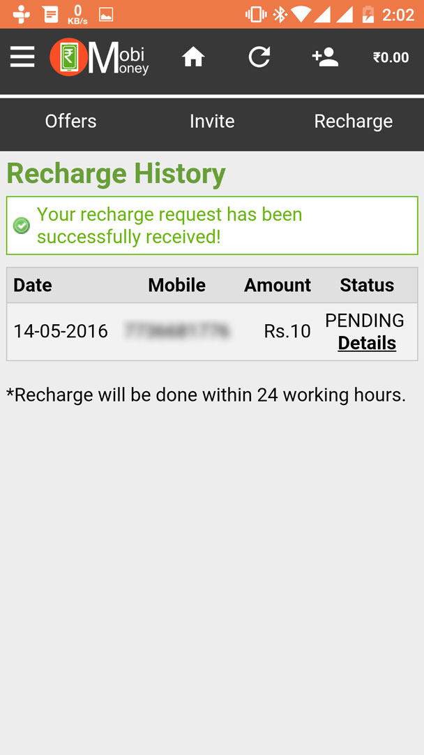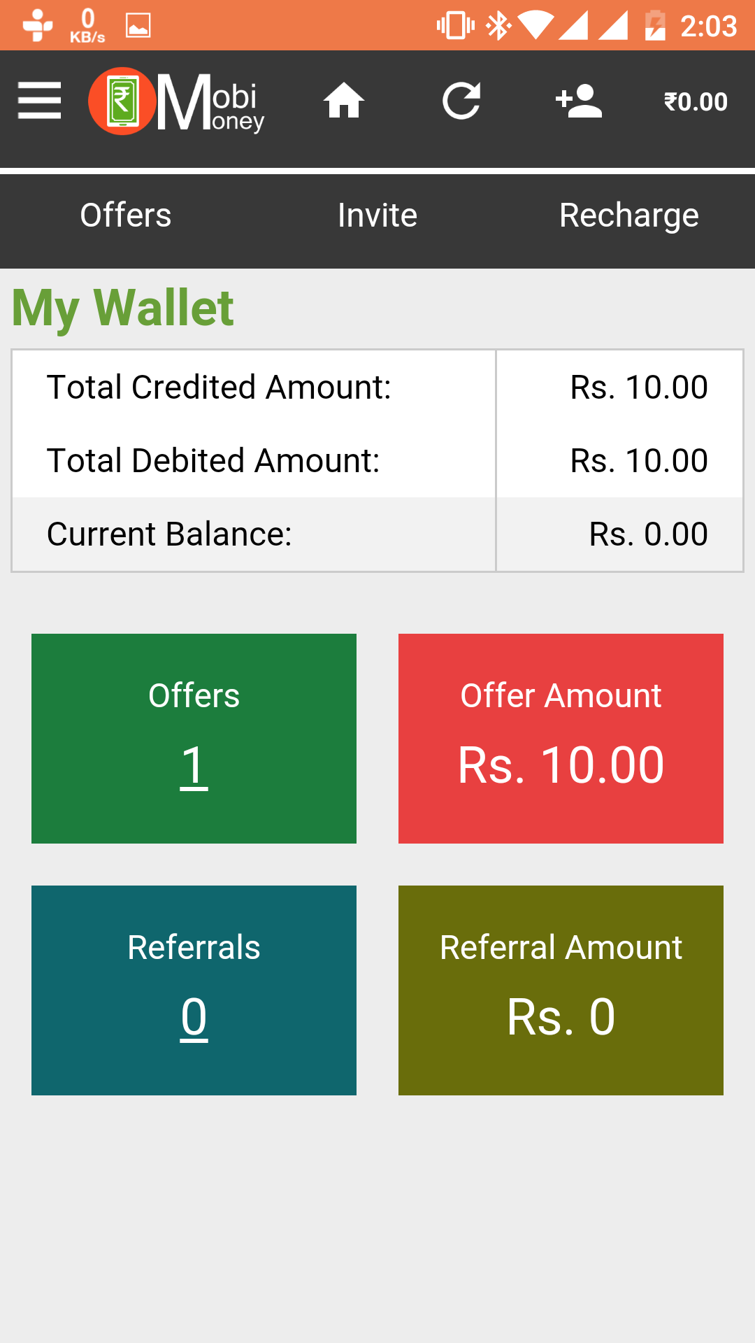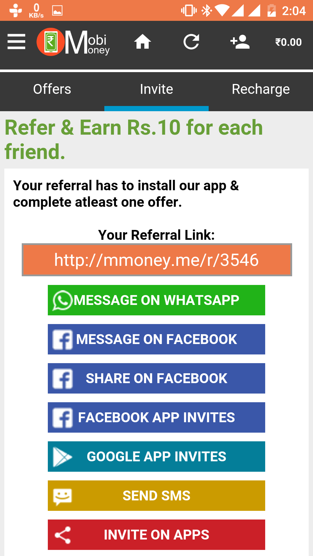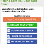 You can also earn by referring your friends . You can earn Rs. 10 for each friend install MobiMoney – Free Recharge App and compete at least one offer .