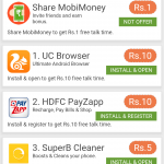 MobiMoney is an Android app Available in playstore. It is similar to EarnTalkTime application. We can get free talktime by installing few apps. UC browser , Amazon , Flipkart etc are the popular apps available to install .