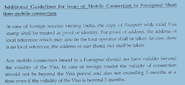 According to latest guidelines on “New prepaid and postpaid mobile connections”, which came into effect immediately DoT has told to all mobile service providers that the proof for issuance of a postpaid and prepaid mobile connection to any foreigner would be the passport having a valid visa and validity of mobile connection should not be beyond the visa period and also not exceeding 3 months at the time even if the validity of Visa is beyond 3 months.