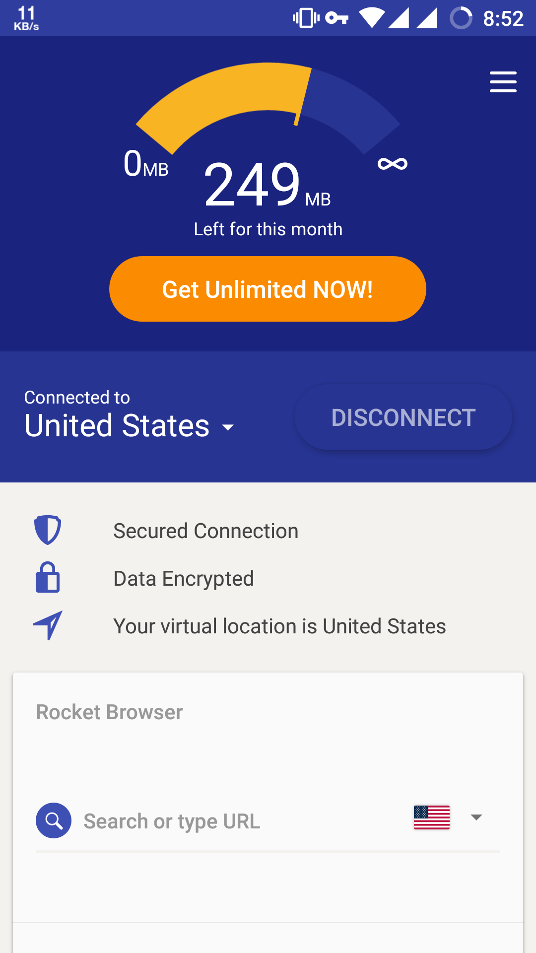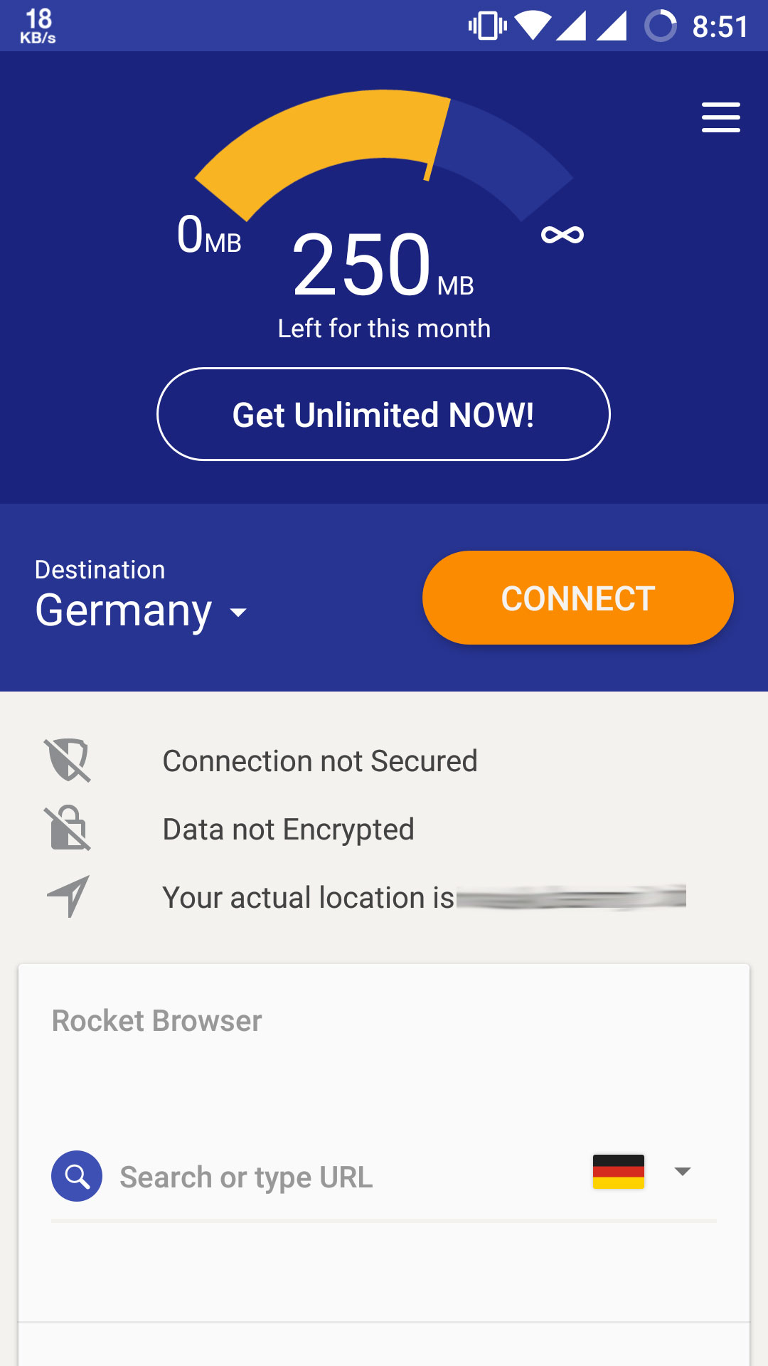 Suppose you choose Germany, then a connection request will popup mentioning that Rocket VPN wants to set up a VPN connection that allows it to monitor your network traffic. After you get connected, the 250 MB that is promised will start to count according to your usage. When you opened the app for the first time, it showed like the connection is not secured and the data is not encrypted. But after establishing a connection, the new screen has notifications mentioning it is a secured connection and the data is encrypted. It also points out the virtual location that you opted earlier.
