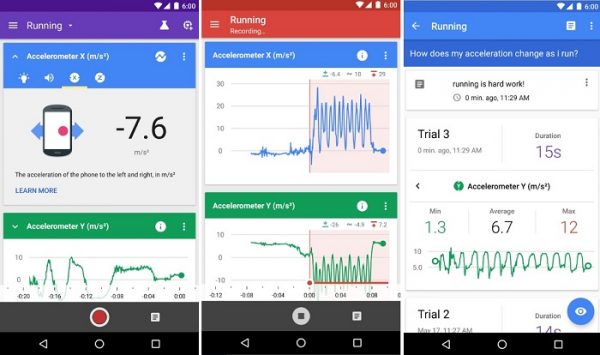Users can store several projects in the app, and use tools like an accelerometer, plus light and sound meters, in order to gather information for their projects. For example, a user could record their running pace everyday for a week , and then chart their progress on a line graph. While the number of sensors available to use is still small, Google says it will work with people in the science community to continually improve the app.